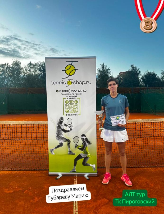 Поздравляем Губареву Машу с бронзой в одиночке на турнире АЛТ в теннисном клубе Пироговский. Маша тренируется в группе для любителей-спортсменов под руководством Дорофеева Максима Олеговича.